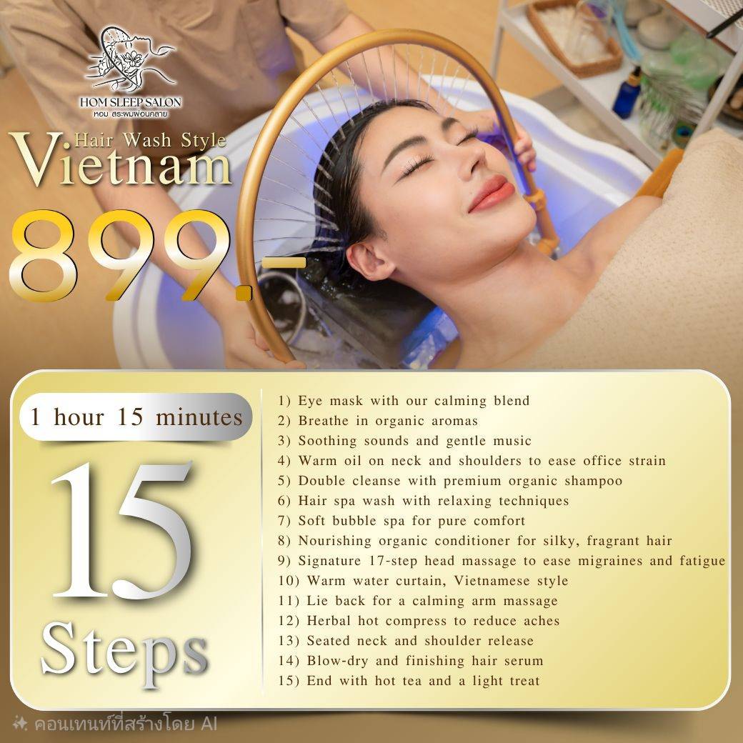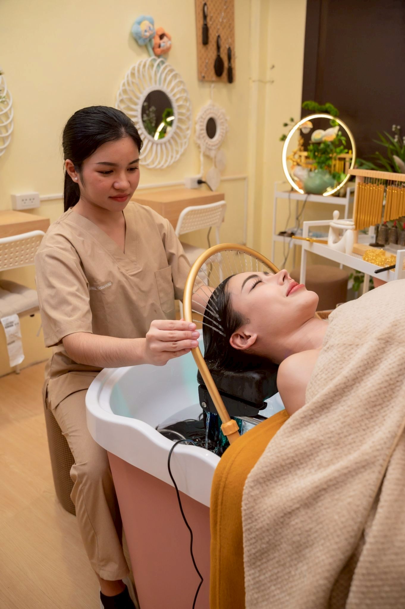 Our Head Spa is more than a treatment; it is a 1.15-hour restorative ritual. We combine traditional Vietnamese water therapy with 17-step Thai massage techniques and organic botanicals to release cranial tension and treat Office Syndrome at its root.